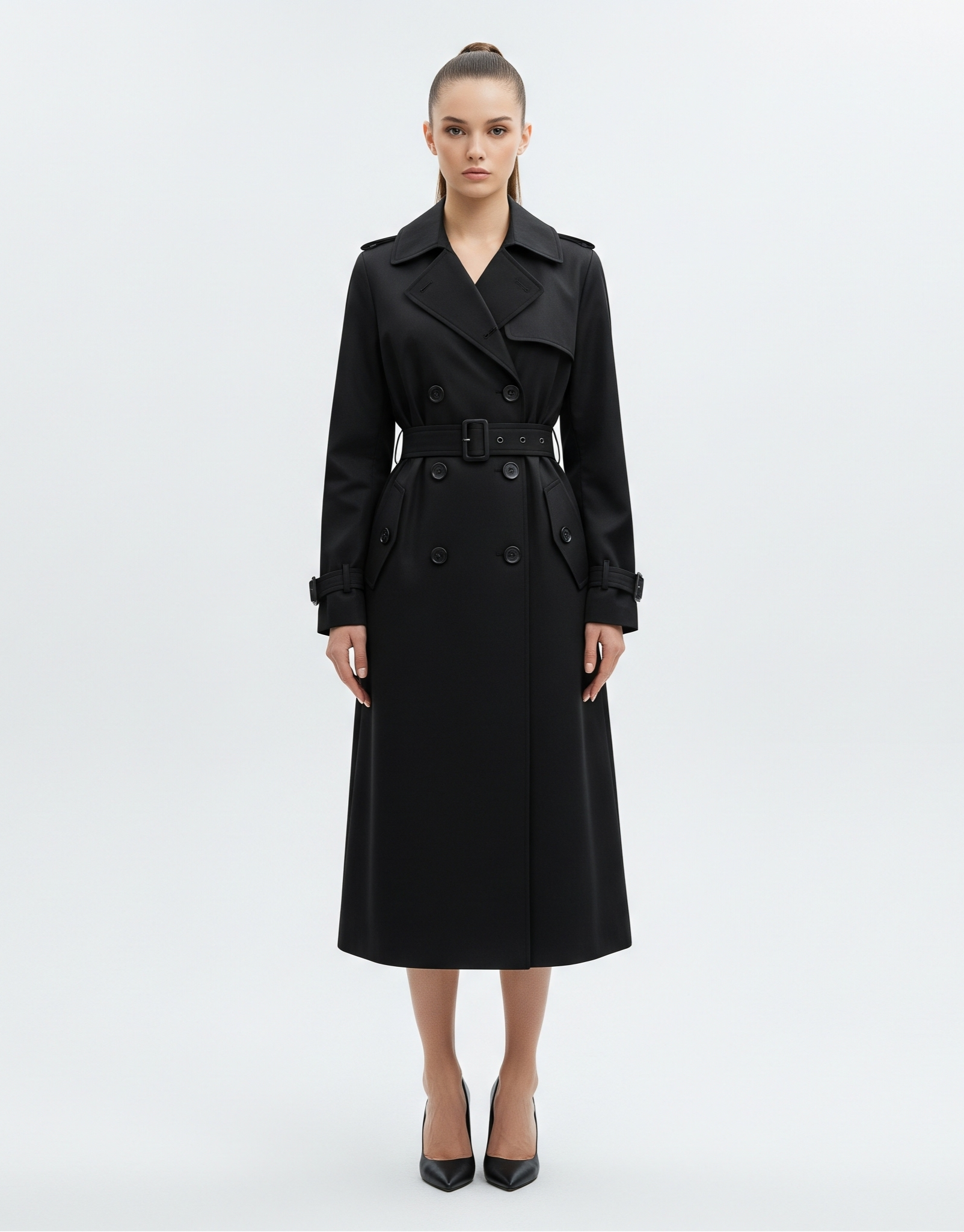 Crafted from a premium, structured fabric, the coat offers a sleek, commanding finish that is both timeless and impeccably contemporary. The deep black hue provides a versatile and powerful foundation for any look, transitioning seamlessly from day to night, formal to casual. The silhouette is a refined interpretation of the iconic trench, featuring a sharp, clean-lined design with double-breasted buttoning, a classic notched lapel, and a waist-cinching belt that flatters the figure.